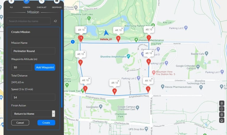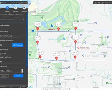 Define patrol routes and schedules through the web interface and track active flights in real time.