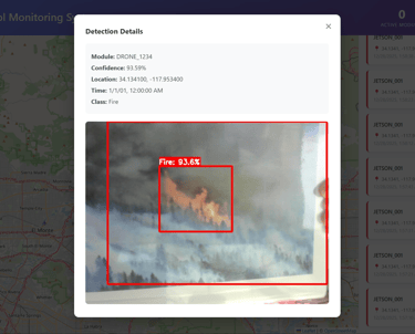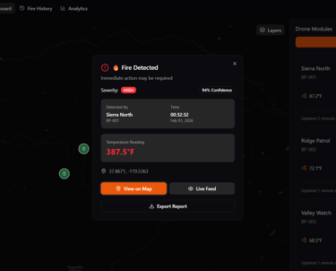 When potential fires are detected, the system sends alerts for user confirmation with live aerial imagery and key data.